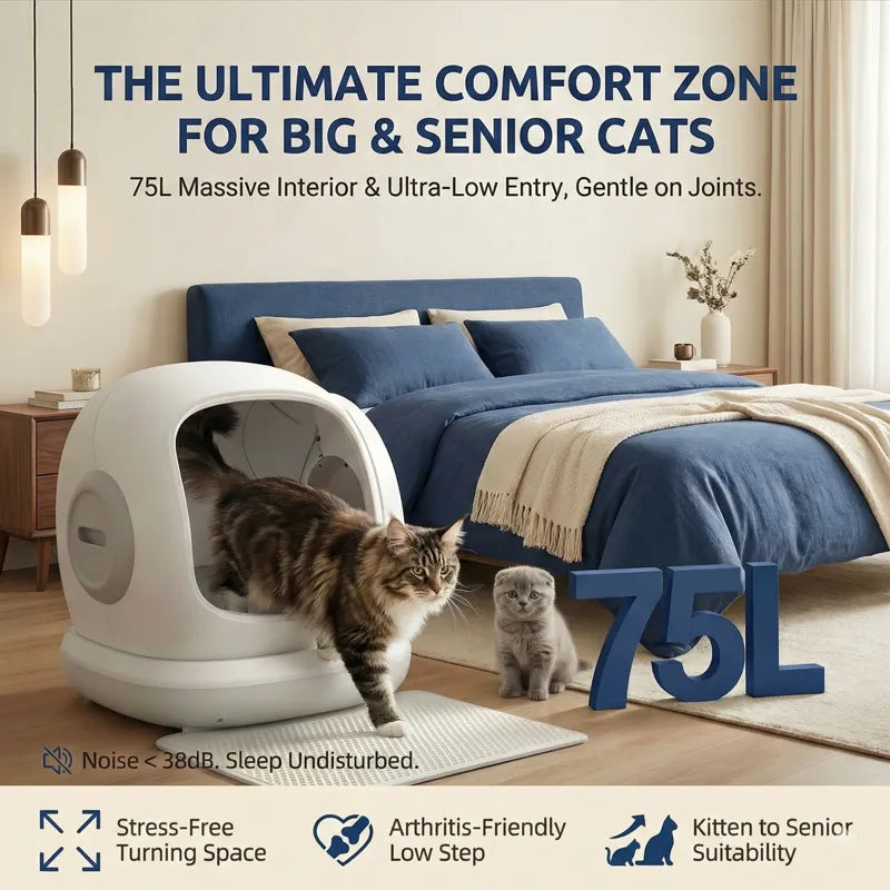 A roomy 75L interior gives large cats plenty of space to turn comfortably, while the low-entry design makes access easy on aging joints. Less than 38dB, so your cat enjoys peace and you get a good night's sleep.