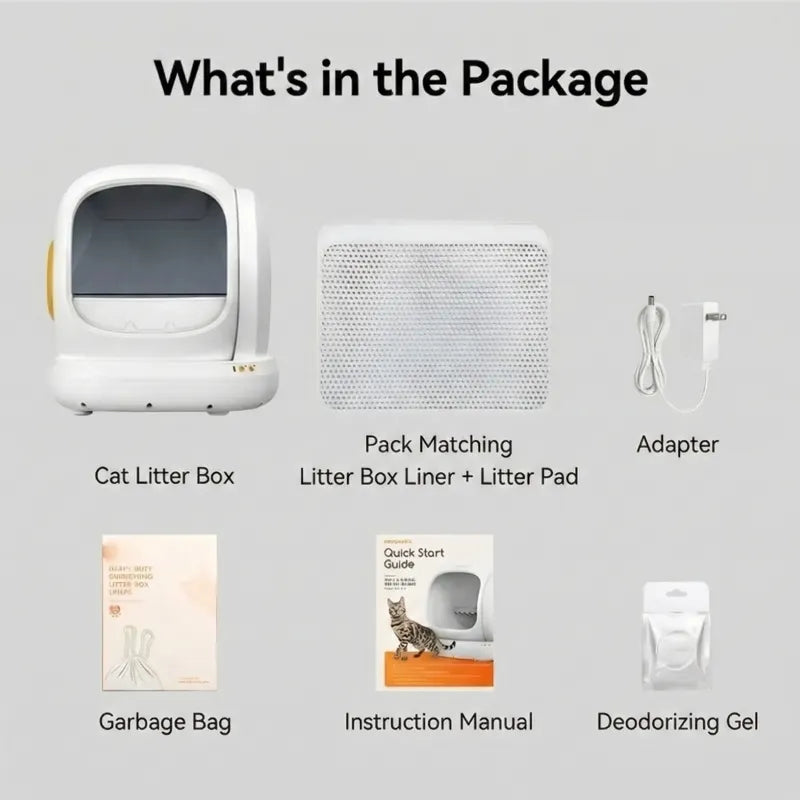 Each package includes automatic litter box*1, cat litter mat*1, litter box liner*1, deodorant gel*1, adapter*1, instruction manual*1